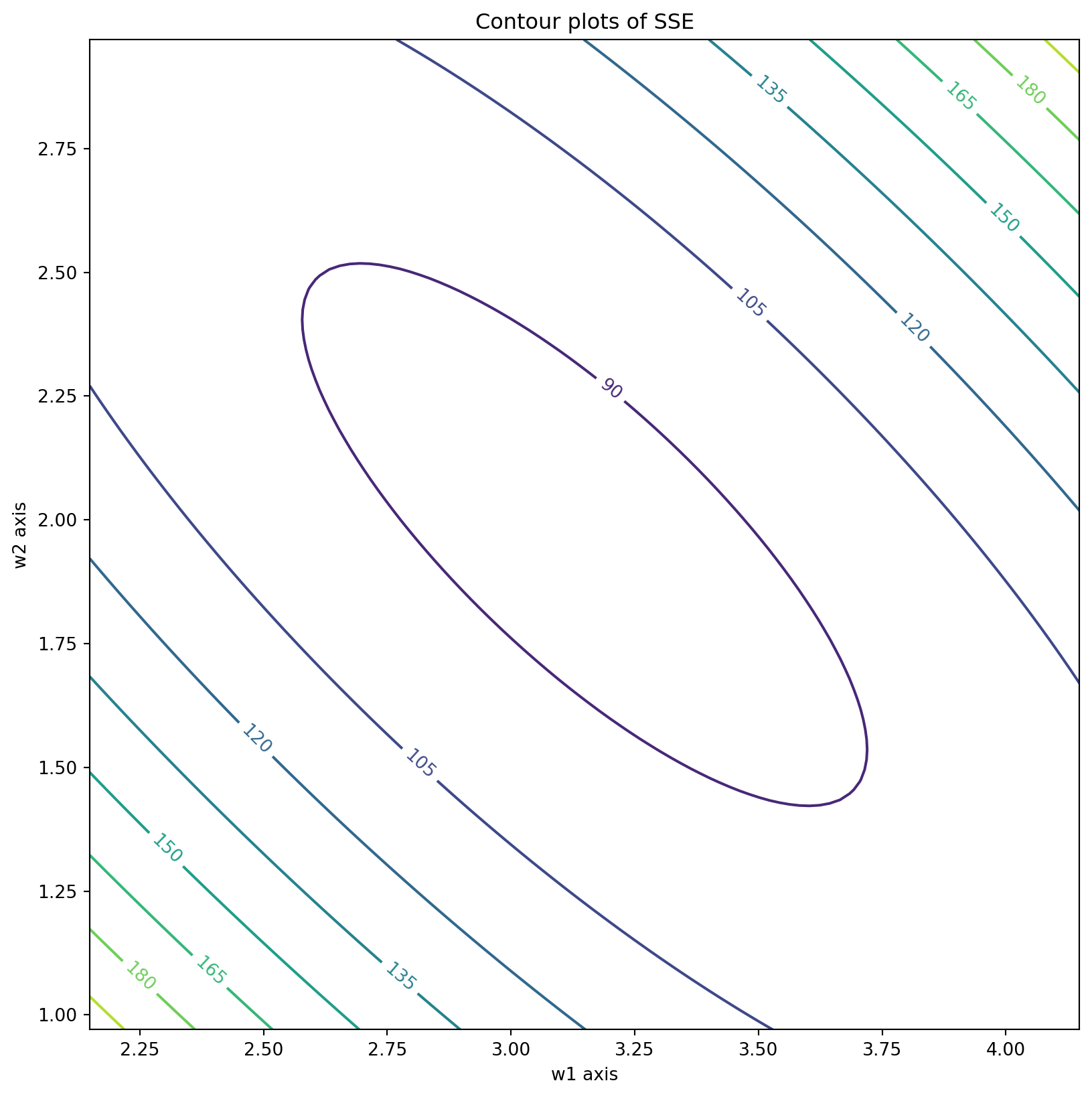 For ease of visualization, let’s consider a 2D dataset which has \(n\) datapoints each having two features, say \(x_1\), \(x_2\). The numerical values of these features for the \(i\)-th vector \(\mathbf{x}_i\) are denoted as \(x_{1i}\) and \(x_{2i}\). The label for \(\mathbf{x}_i\) is \(y_i\). The linear regression model is \[ f(\mathbf{w}, \mathbf{x}) = \mathbf{w}^T \mathbf{x} = w_1 x_1 + w_2 x_2 \] where \(\mathbf{w} = \begin{bmatrix} w_1 \\ w_2 \end{bmatrix}\) is the weight vector which needs to be chosen so that the sum of the squared errors (SSE) is minimized. The error for the \(i\)-th datapoint is \[ \mathbf{w}^T \mathbf{x}_i - y_i = w_1 x_{1i} + w_2 x_{2i} - y_i \] (I have removed the intercept term as it will make the loss function a three variable function which will be difficult to visualize).