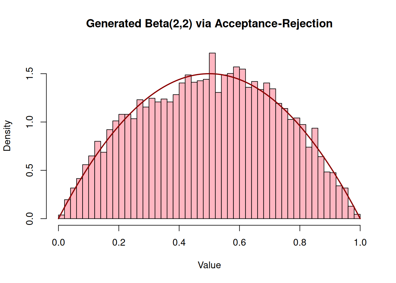 n_samples <-10000accepted_samples <-numeric(0)c_val <-1.5# We will generate pairs of uniforms to act as Y and Ufor (i in1:n_samples) {# In practice, you'd pull from your LCG sequence. # Using runif here for clarity in the loop structure. Y <-runif(1) U <-runif(1) f_Y <-6* Y * (1- Y) g_Y <-1if (U <= f_Y / (c_val * g_Y)) { accepted_samples <-c(accepted_samples, Y) }}hist(accepted_samples, breaks =40, freq =FALSE, main ="Generated Beta(2,2) via Acceptance-Rejection", xlab ="Value", col ="lightpink")curve(dbeta(x, 2, 2), add =TRUE, col ="darkred", lwd =2)