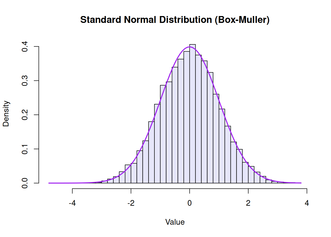 # Split the sequence in halfU1 <- rand_seq[1:5000]U2 <- rand_seq[5001:10000]# Apply the transformZ1 <-sqrt(-2*log(U1)) *cos(2* pi * U2)Z2 <-sqrt(-2*log(U1)) *sin(2* pi * U2)# Combine them for a total of 10,000 standard normal variablesrand_normal <-c(Z1, Z2)hist(rand_normal, breaks =50, freq =FALSE, main ="Standard Normal Distribution (Box-Muller)", xlab ="Value", col ="lavender")curve(dnorm(x), add =TRUE, col ="purple", lwd =2)