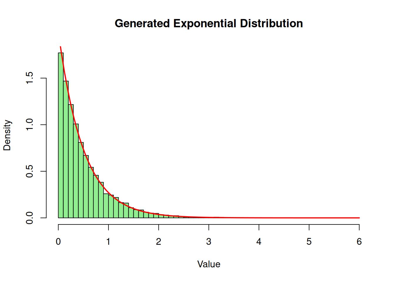 lambda <-2# Rate parameter# Using rand_seq from our LCGrand_exp <--(1/ lambda) *log(rand_seq)hist(rand_exp, breaks =50, freq =FALSE, main ="Generated Exponential Distribution", xlab ="Value", col ="lightgreen")# Overlay the theoretical density curvecurve(dexp(x, rate = lambda), add =TRUE, col ="red", lwd =2)